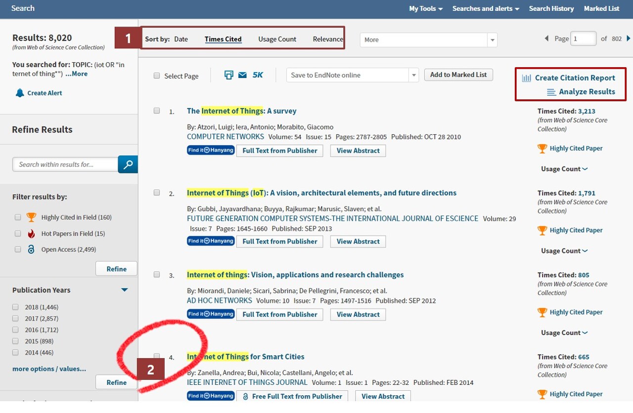 4. 검색결과를 여러 가지 측면에서 분석할 수 있는 Analyze 기능과 해당 논문들의 인용정보를 분석하여, 연구의 흐름 및 방향등에 참고할 수 있는 Citation Report 기능도 이용하실수 있습니다.