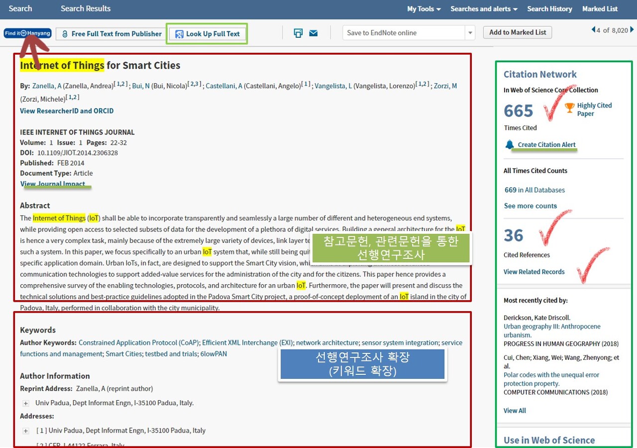 7. 특히 Author keywords, Keywords, KewWords Plus를 참고하여 키워드를 확장하고, 선행연구조사를 확장해 나가야 합니다.